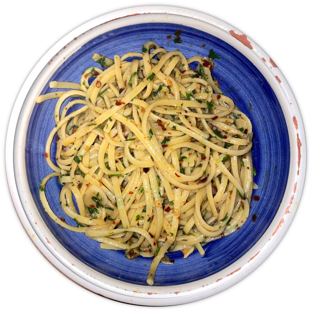 - Drain the linguine but save half a cup of the pasta water. Add the linguine, pasta water and a pinch of salt to the pan with the garlic and mix well on a high heat.